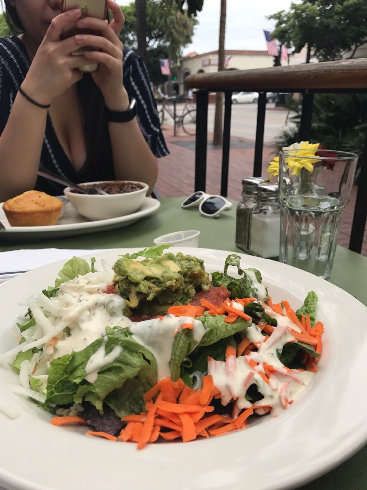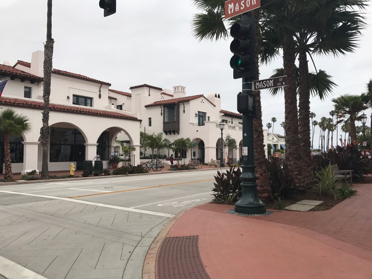- Santa Barbara. Lunch time! We made it to Santa Barbara which had a very laid-back feel…I think it was safe to say we made it to SoCal ;). We enjoyed our light lunch outside and took a stroll through the Spanish-inspired streets filled with small white houses with red roofs as well as along the beach side, very relaxing.