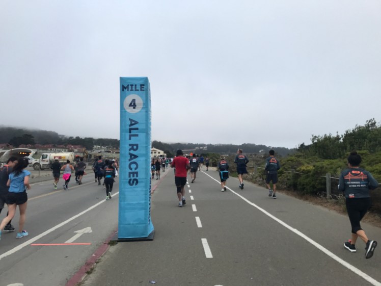 When it was finally our turn to go, we ran off and I was legitimately contemplating peeing myself (this blog knows I like to over-share). The moment I saw a porta-potty around 0.5 miles, I knocked down one of the gates and charged for it. I ran so fast a cable car had to stop in its tracks! SO worth adding a minute to my time to have so much more comfort for the rest of the race.