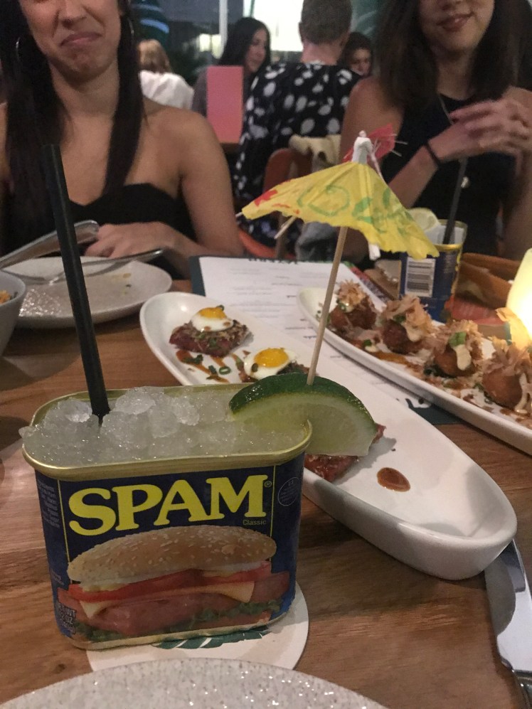 In the evening, the girls got together again and we threw Sarah a surprise birthday party. Sarah is in obsessed with spam, and so this Hawaiian spot that served cocktails in spam containers was the perfect, whimsical spot. The group had a hilarious time over our 3-hour meal – happy birthday Sarah!!