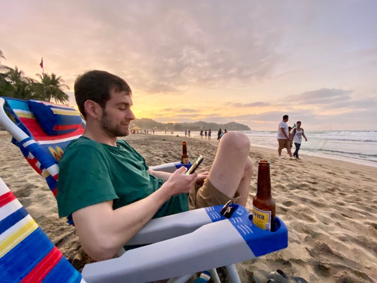 By the time surfing was over, it was already golden hour. We took our beach chairs (conveniently as fashionable backpacks), bought some beers, and plopped down in our usual spot for the sunset. I love how Joe and I fell into a mini-routine everyday while still filling each moment with excitement.