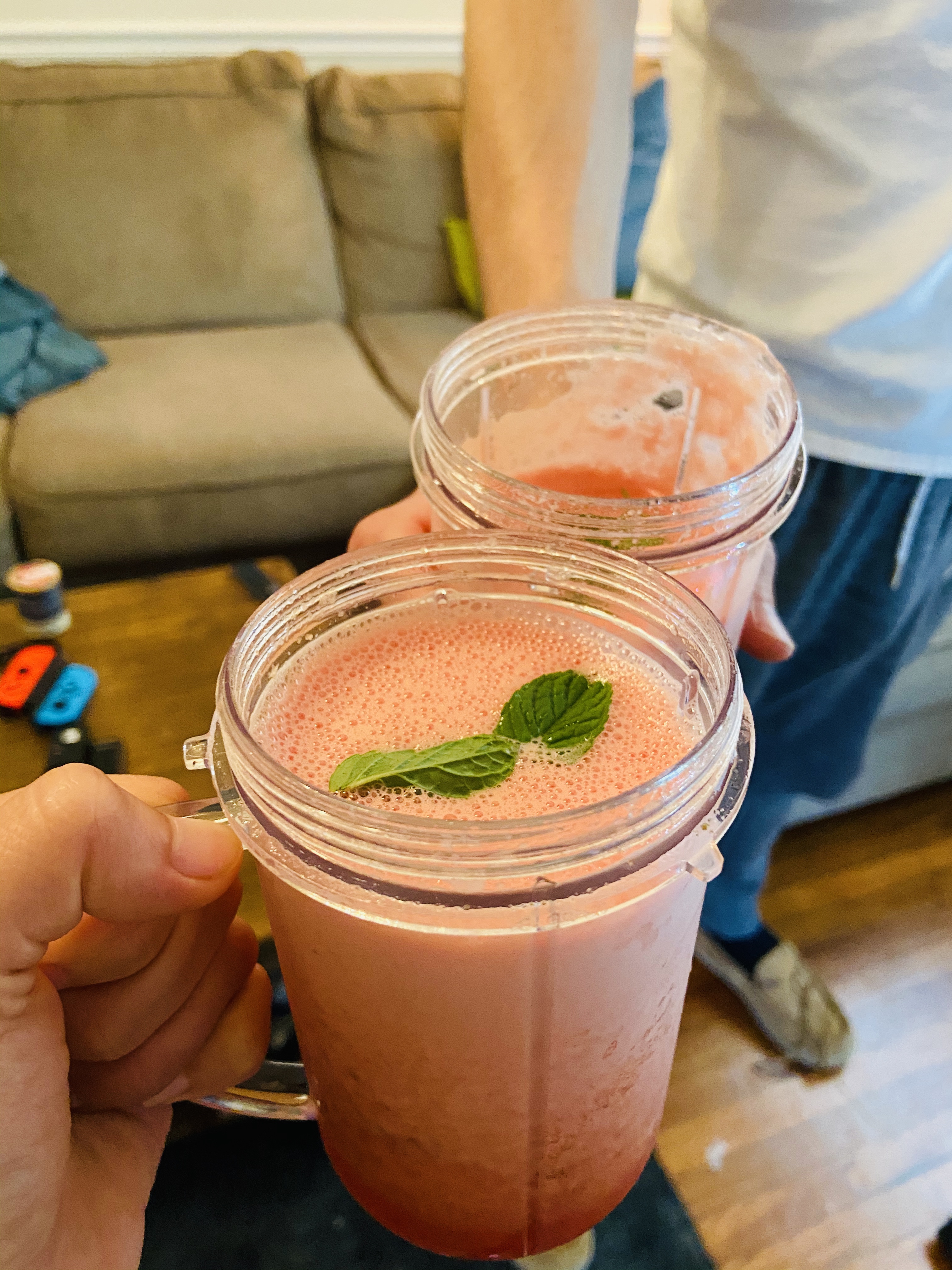 Joe and I have been obsessed with watermelon this summer. We buy several every week and plow through them! My favorite way to eat the fruit is through a super easy 3-recipe cocktail: blend watermelon, vodka, and fresh mint, run it through a strainer, and that’s it! The mint is fresh from our herb garden which makes it extra special.
