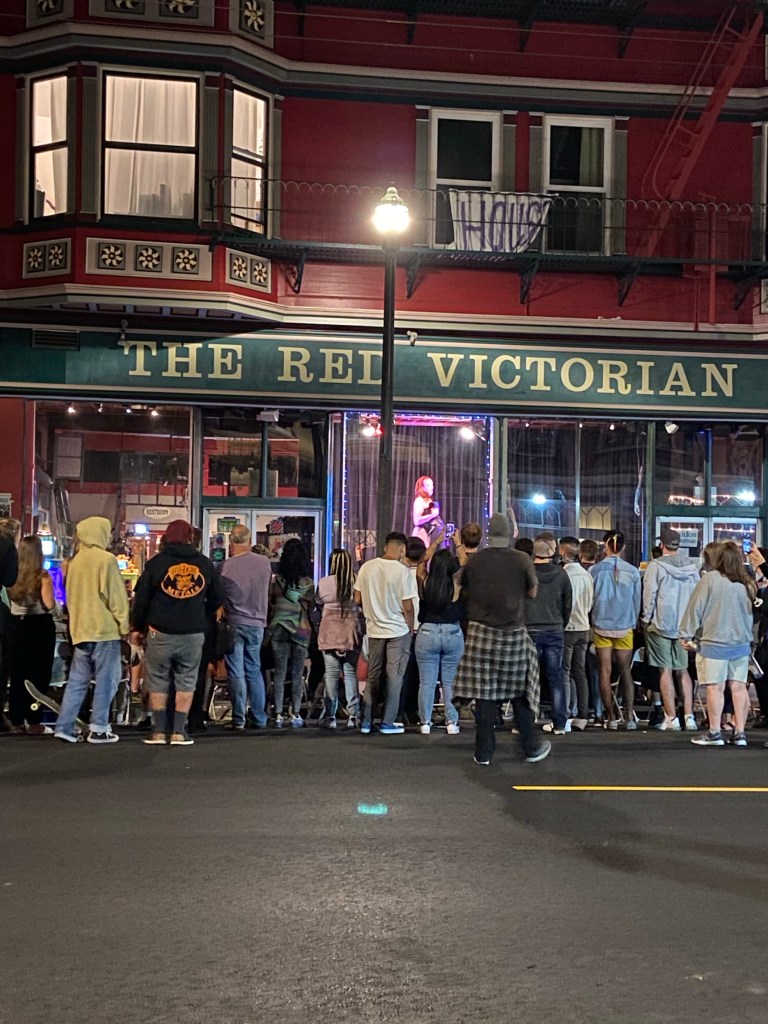 In the middle of the party, Rene, Rachel and I stepped out to watch a drag show on Haight Street. There were some dancers putting on a show for charity through the window of The Red Victorian. We stayed back to avoid the crowd and it was quite the festive show – I’ll take anything out of the box during COVID!