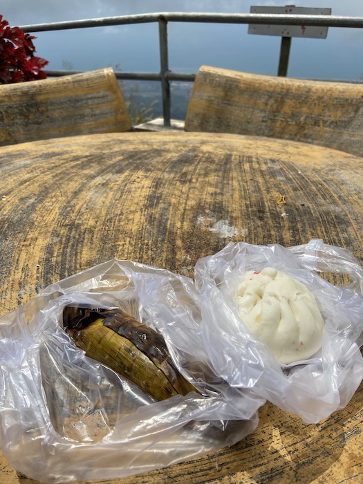Pork buns and sticky rice & plantains in a banana leaf for lunch.