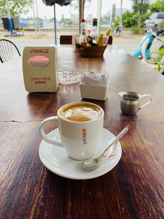 First, I started off my day with breakfast at Kampot Pie & Ice Cream (they have great breakfast despite the name). I’ve been waking up pretty early on this trip (~6am), so I usually need to venture to town for coffee as the hostel kitchen isn’t open yet. I came here almost every day in Kampot – the staff remembered my order after just one visit, and they treated me like a regular from day 1. I loved the welcoming atmosphere here which kept me coming back. 🙂