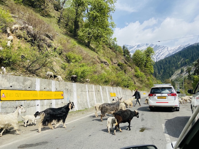 We decided to drive to Koksar, a mountain town ~1 hour from Manali at even higher elevation (10,300 ft / 3140 m). The drive was super scenic as we climbed the mountain jammed in traffic by goats. 😛