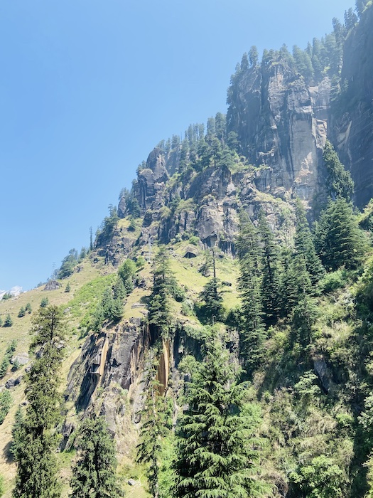 The waterfall required a decent hike. We started early in the morning and had the trail to ourselves. We were greeted with huge rock formations, pine tree forests, and views of Manali below.
