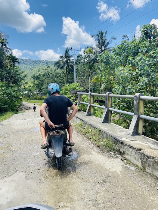 My last day in Indonesia! It was a very memorable one. Arif had been talking about taking a day trip with the whole crew since day one, and we finally made it happen on my final day. We hopped on our scooters to another part of the island, about a 2-hour drive. It was quite the adventure with our janky scooters. Mine broke down SO many times! Me and my riding mate got really good at hopping off, kick-starting it, and hopping back on in 10 seconds flat – just fast enough to keep the crew within sight. 😛