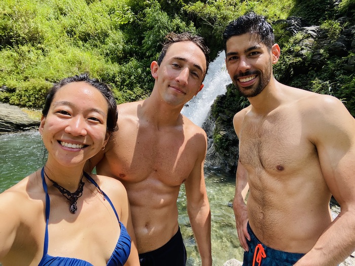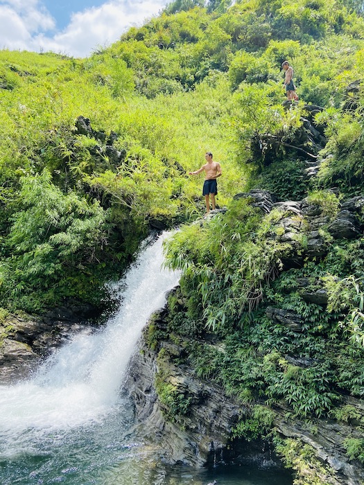 Our main stop of the day was Du Gia Waterfall, a 15-minute drive from town. Along the way, we picked up some kids who were hitchhiking to the waterfall. Why not? 😉