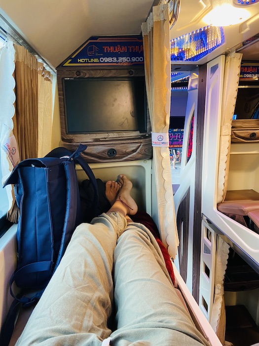I took a night bus from Hà Giang to Halong – about 11 hours. Luckily, my bed was pretty comfortable and the perfect Vietnamese-person size, which worked well for me. 😉