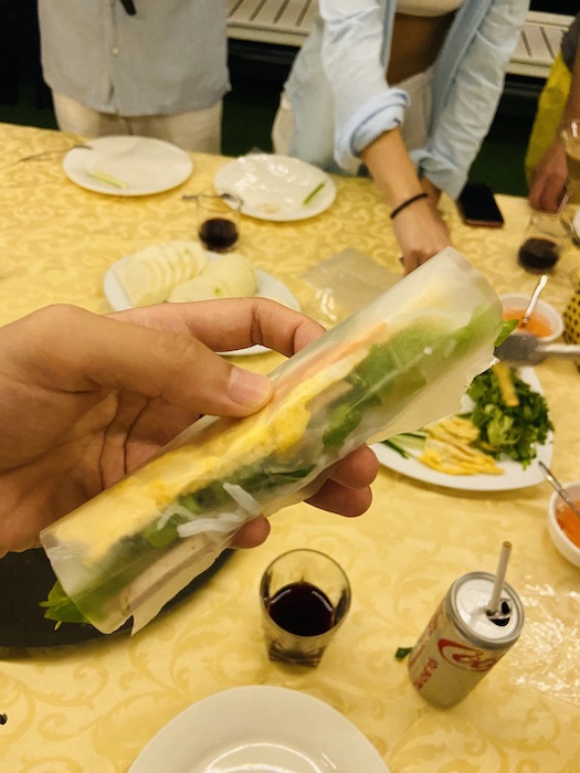 Next, we had a cooking class. Our tour guide showed us how to make Vietnamese spring rolls. Seemed simple enough. 🙂