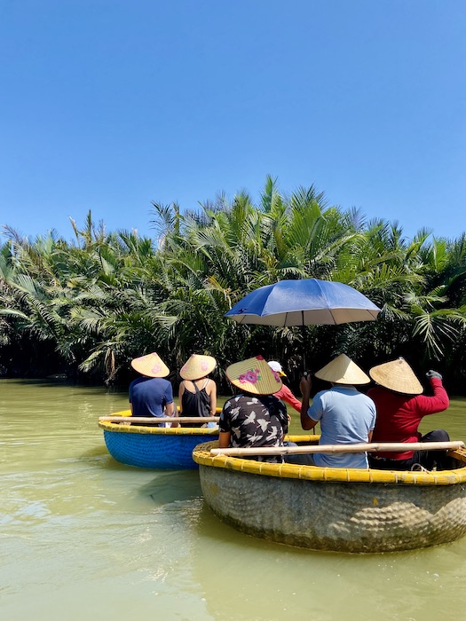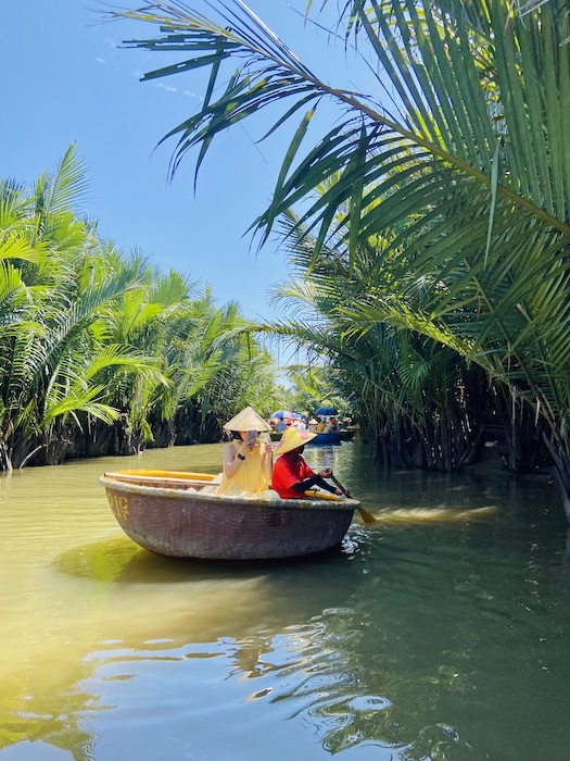 After the market, we headed for a fun activity…a basket boat ride! If you’re wondering what that is, it’s exactly what it sounds like – a massive basket serving as a boat. π This is a popular activity in Hoi An as it takes you through some pretty riverside views. Thank god for my handheld electric fan that I bought yesterday, as we were under the sun for about an hour.