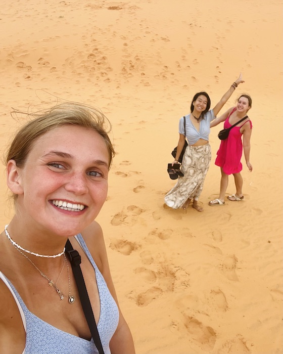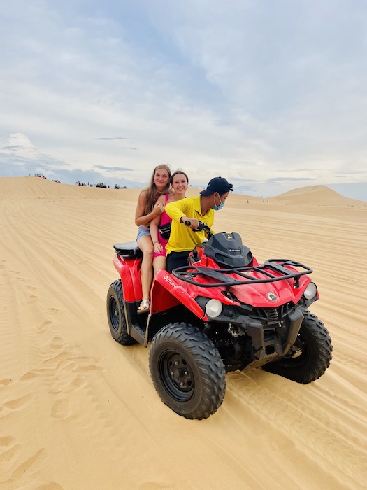 I arrived at Mui Ne from Da Lat the evening before by bus – about 5 hours. I checked into Eva Hut Mui Ne Hostel and said hi to my two German friends, Nele and Finja, who were also in town. You might remember them from my Ninh Binh and Hoi An posts – we’ve overlapped in 3 cities in Vietnam, and we were excited to catch up since the last time we saw each other.