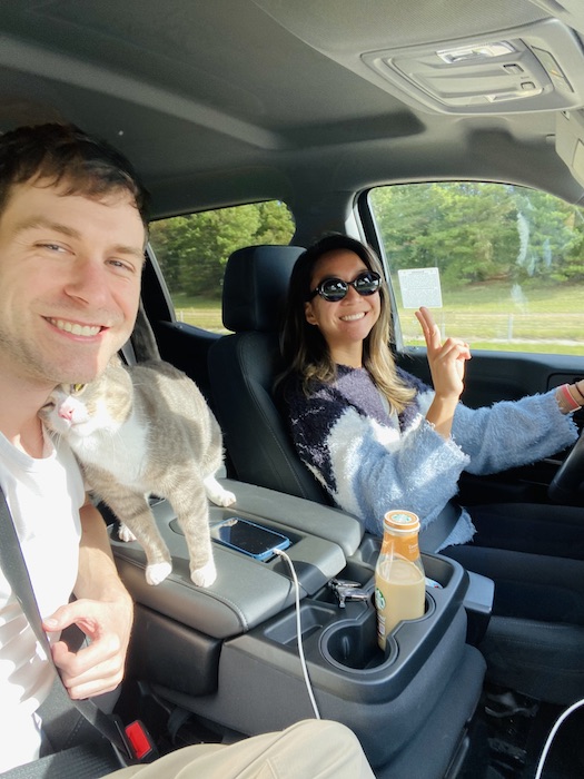 But first, our trip started off with a last-minute, difficult decision. We decided to leave our male cat, Ben, with Joe’s parents for this road trip. 😦 Our dream was to have both cats with us, but we’ve been struggling with Ben as he has severe anxiety and motion sickness when we travel (vomiting, yowling, panting, trembling, pee/pooing outside litter box, foaming at the mouth, etc.) We actually noticed this behavior for several years and have tried all the remedies in the book — positive reinforcement/exposure therapy, different-sized carriers, scented calming collars, even medication…but nothing seemed to work.