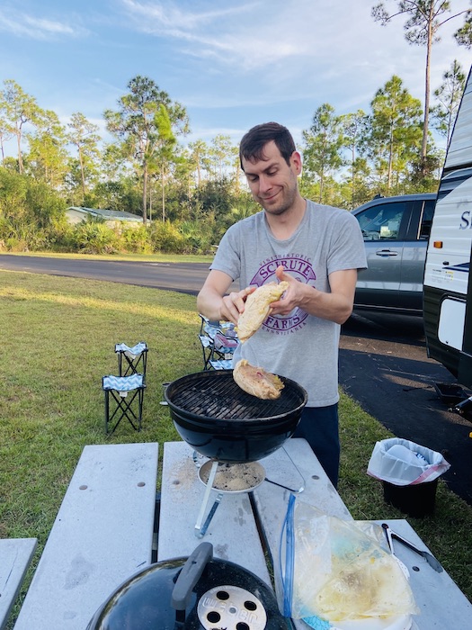 We cooked most of our meals at our campsite since we were pretty far from civilization. Fortunately, our propane tanks powered our stove, so we didn’t have any issues cooking. We also grilled outdoors several times as we’re in love with our little grill!