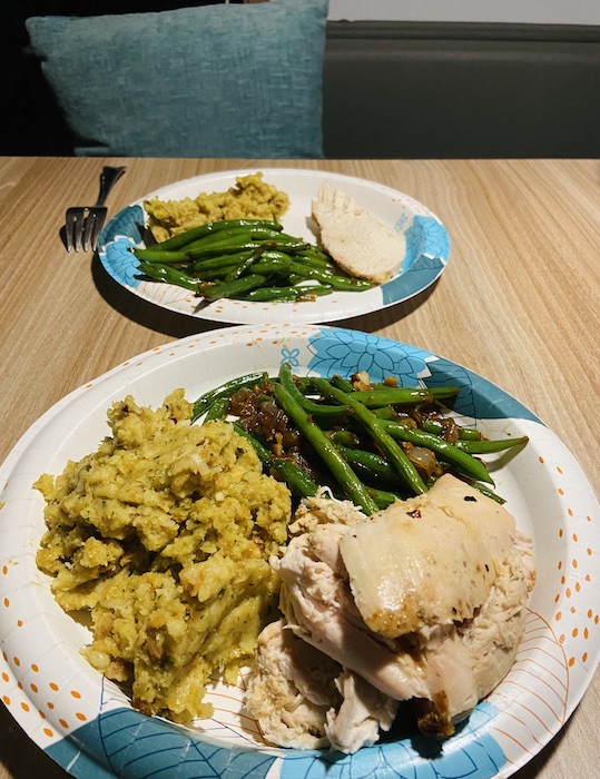 Joe and I made a Thanksgiving feast for two. Joe grilled his famous marinated chicken and I made our two favorite Thanksgiving sides: stuffing and green beans.