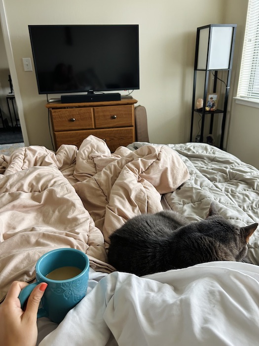The next morning, I woke up feeling much better. I took longer than usual emerging out of bed because Ben was snuggling next to me. It was funny to see the two cat’s behavior change this week with Joe gone. I had to admit, I loved the extra cat attention, especially from Ben. Flashback to when we split up the cats and Ben lived with me for a year in my studio. I have such fond memories of this time as Ben never left my side. I think Joe leaving triggered his memory and he was back to being the affectionate Ben I remembered. β€
