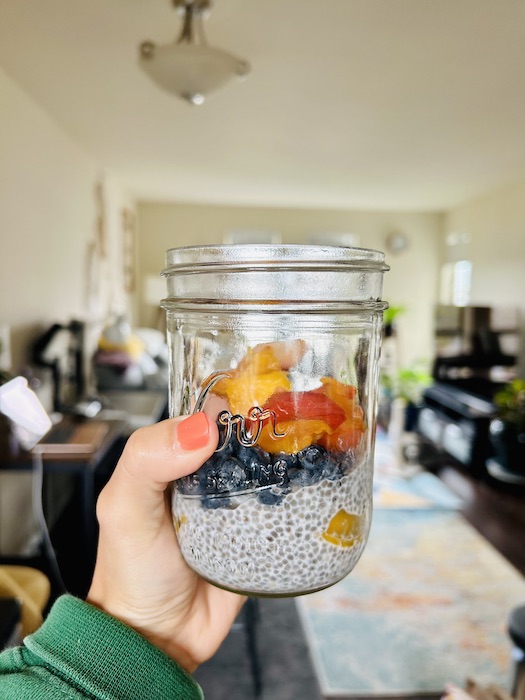 For breakfast, I had chia seed pudding topped with peaches and blueberries. I’ve been experimenting with chia seeds for a while now and I think I finally found a combination that I love. I was struggling with finding a good sweetener for the pudding, but I found that sweetened almond milk + fruit is the perfect level for me.