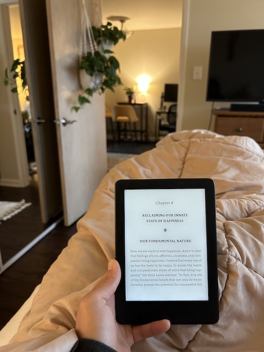After meditating, I’ll either journal or read a passage on Buddhist principles – I usually only have time for one or the other. Right now, I’m reading The Art of Happiness by the Dalai Lama. The book has a practical mix of Western psychology and Eastern Buddhism. I’m enjoying it so far, and just a few pages in the morning helps ground me throughout the day.