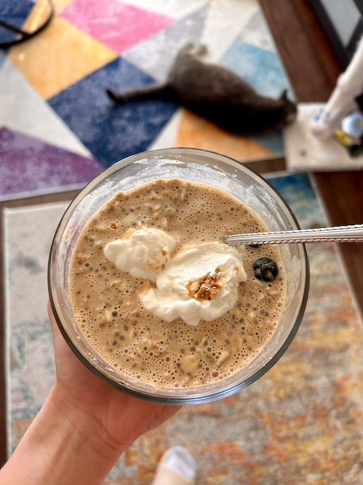 Another random tangent – I’m the type of person who eats the same breakfast for several weeks at a time, and then I move onto something else. Right now, I’m in love with overnight oats. I’ve always been a hot oatmeal person, but switching to overnight oats helps me save time in the mornings. I’ve been experimenting with different toppings. Right now, my favorite combo is old fashion oats, chia seeds, almond milk, powdered peanut butter, frozen blueberries, and greek yogurt. Powdered peanut butter is a new discovery – the nutrition profile is quite attractive, and I’ve been using it more than regular PB lately.
