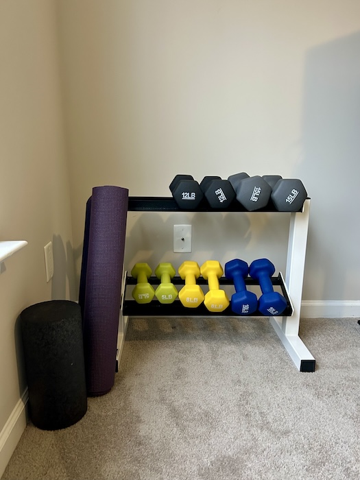 Moving here also meant I needed to figure out my new workout routine. On weekdays, I’ve been working out at home, doing yoga or a strength workout with dumbbells. I love having space for a home gym which has been my dream for a while.