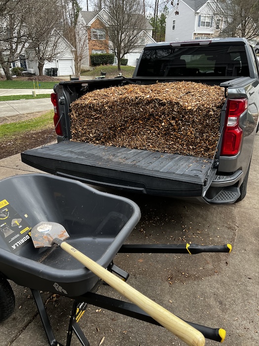Setting these up was no small feat as it required several trips to the mulch/compost yard. Have I mentioned how grateful I am Joe loves this work? They even gave him a punch card which we thought was funny. But after a few trips, they know Joe by name and he’s already redeemed the free cubic yard. 😛